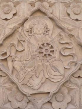 妙因寺在鲁土司衙门的西面。我们沿着一条有些陡峭的小路走了十几米,眼前出现了一座砖雕门楼,门扇上画着藏传佛教的图案。这里就是妙因寺了。妙因寺和鲁土司衙门只有一墙之隔,很多粗心的游客往往参观了土司衙门,却忽略了这座极具地域特色和民族特色的寺院。