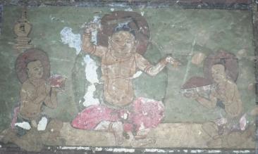 万岁殿的佛传图,隐藏在暗廊墙的墙壁上。暗廊就是由内外两重墙组成的夹道,其宽度五十公分左右,很少有人关注如此狭窄而隐蔽的夹道。正是如此,这些壁画才得以保存下来。