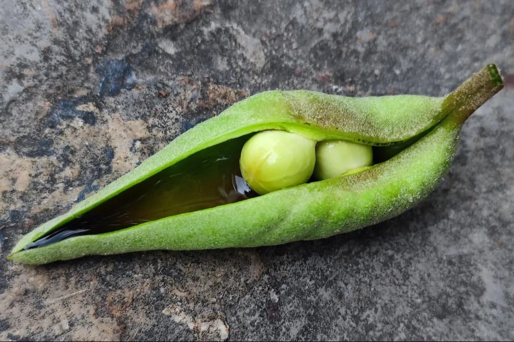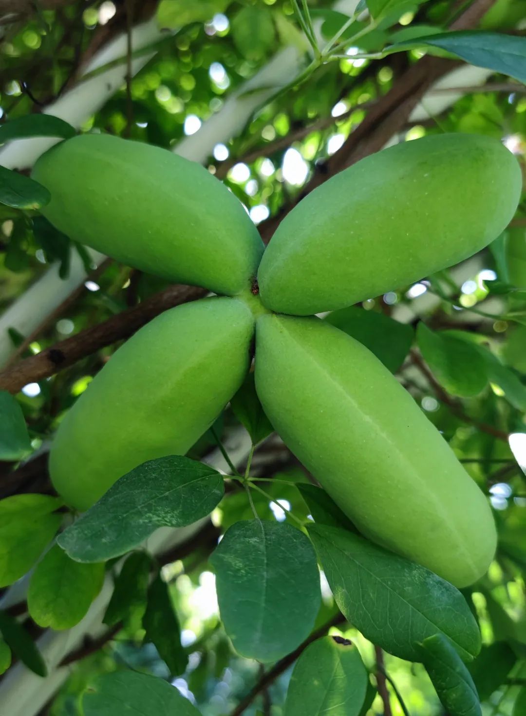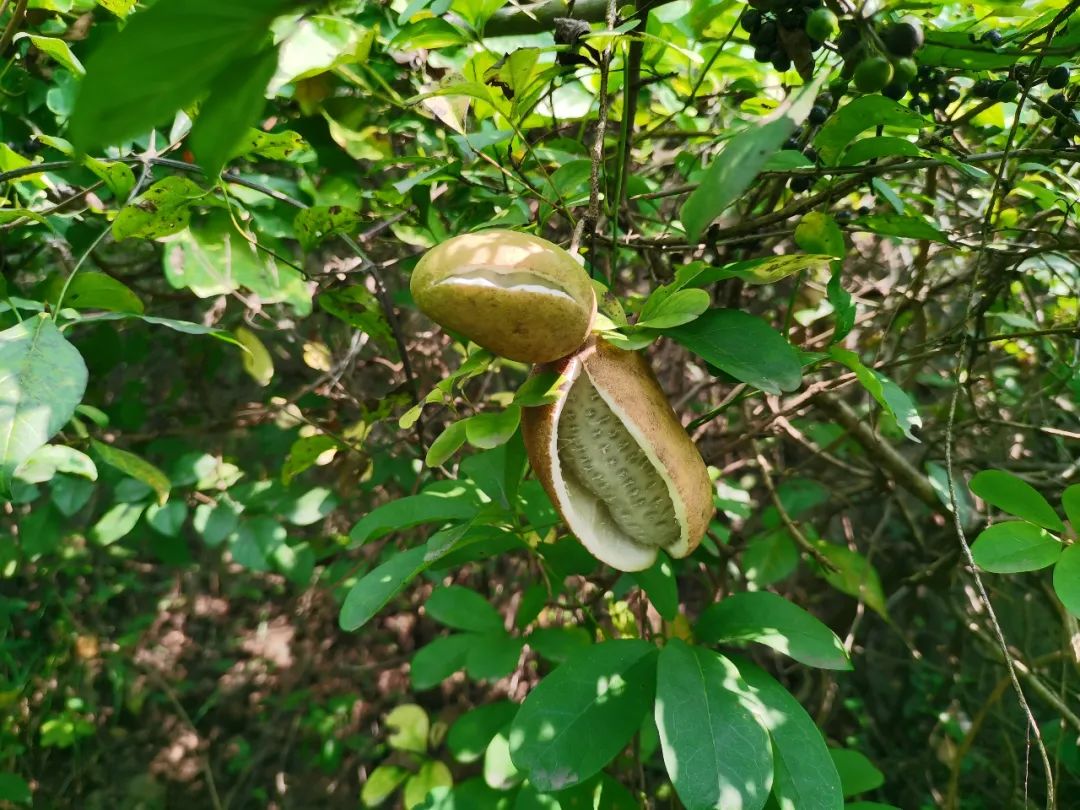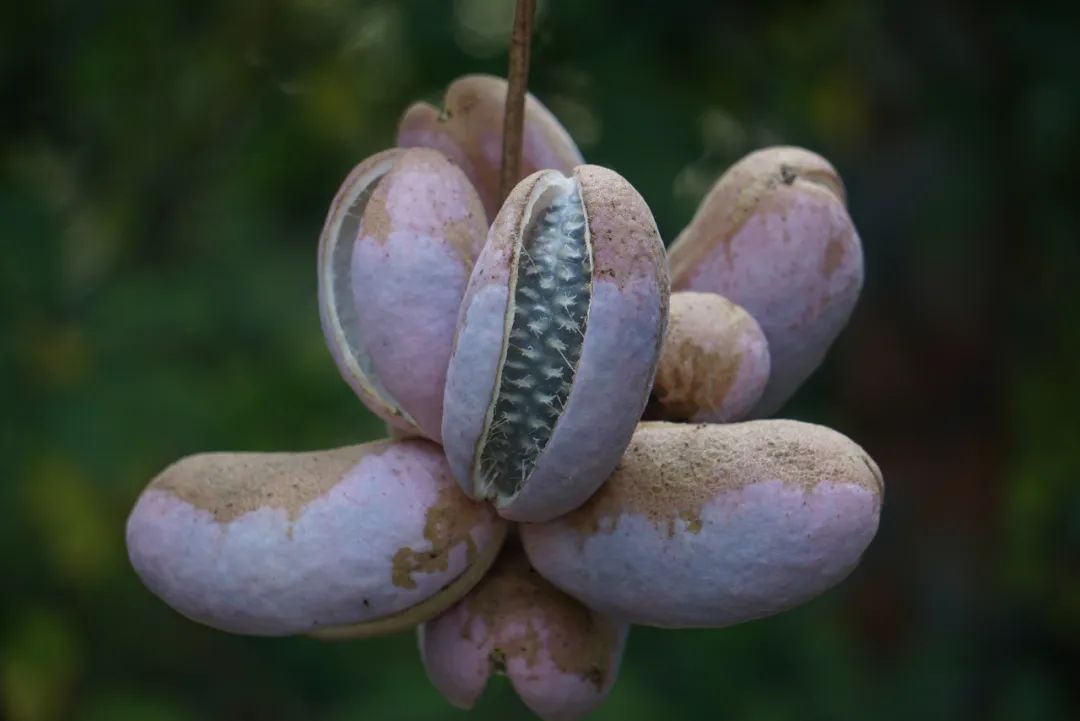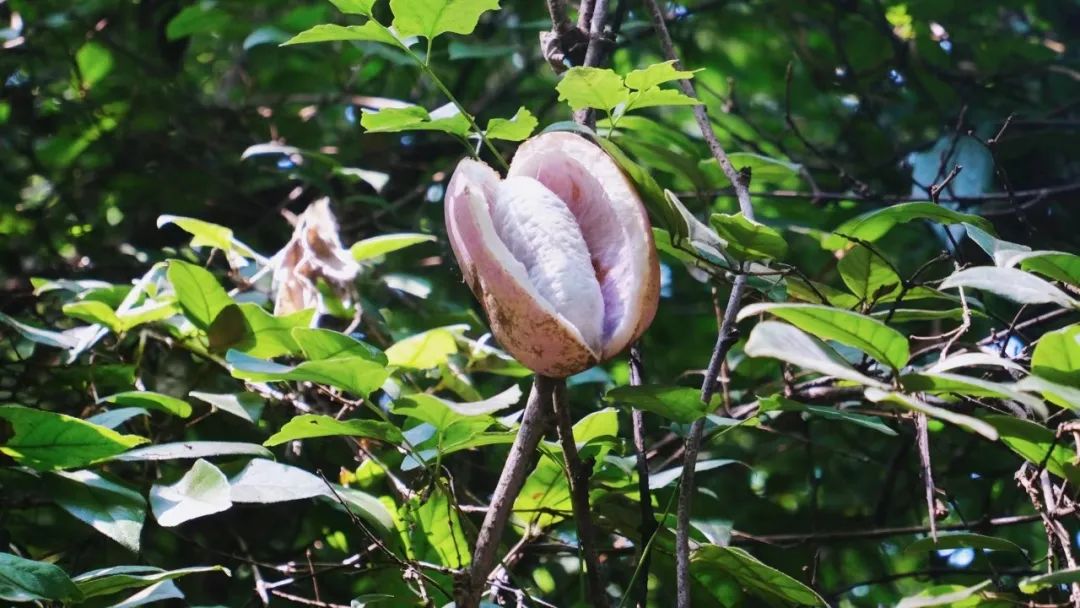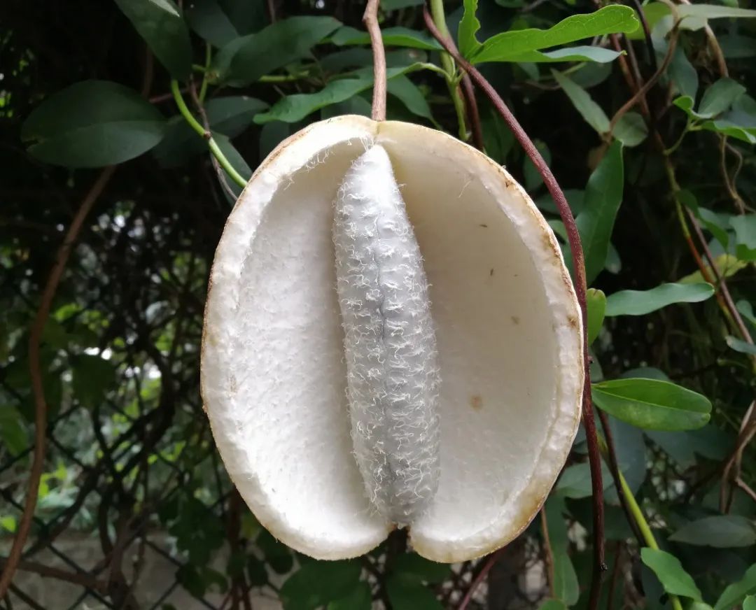 那木通果是沿哪条缝线开裂的呢?又为什么会开裂吗?想起曾经有一次站在梧桐(Firmiana simplex)树下驻足观赏时,忽然有几滴褐色的水珠喷在了我的脸上。原来是梧桐的果实开裂了,里面的汁液也随之喷出来了。我猜想这里面的汁液是不是也可以理解为梧桐的“羊水”在滋养着里面的种子呢?我们知道当果实成熟前,往往伴随着大量乙烯的生成,在阳光的照射下,里面的乙烯和水蒸气挥发和膨胀着,果实内气压也随之增大,当果实内部气压足够大时,果皮便骤然裂开。那木通果果实内虽然没有液体,但随着木通果实的长大,果肉在成熟时由硬变软,会生成大量的乙烯、芳香烃和脂烃类等,也会致使果实内部气压不断增大而使果皮裂开。