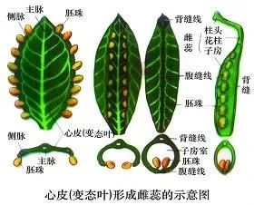 也许你也在好奇为什么它的果实成熟时会开裂,而香蕉不会呢?带着问题,首先我们来看一下它的果实的类型。《中国植物志》里描述木通属的果实为肉质蓇葖果。所谓蓇葖果(follicle)则是由一个心皮形成的的单室果实。这里心皮(carpel)可以理解为一种变态的叶,这个词最早是由我国植物学者李善兰先生在1857年译《植物学原理》时创立,将雌蕊的组成部分称为“心皮”,而雌蕊则是由心皮卷合而成的。这类果实一般为裂果,成熟时果皮会沿腹缝线或背缝线裂开。这里腹缝线相当于叶缘的位置,子房里的胚珠(受精后发育为种子)一般着生于腹缝线上,背缝线相当于叶片主脉的位置。如常见的梧桐、玉兰、牡丹、八角的果实都属于蓇葖果。知道了这些,来试着找找木通果的腹缝线和背缝线吧!