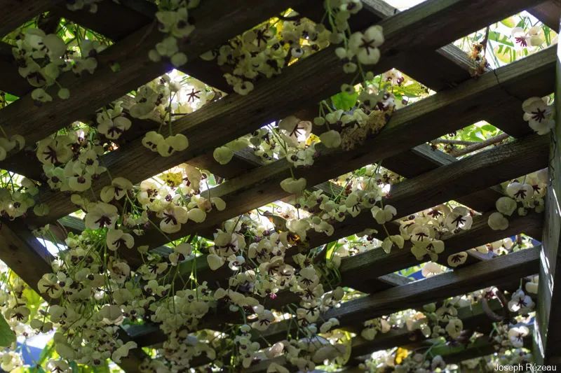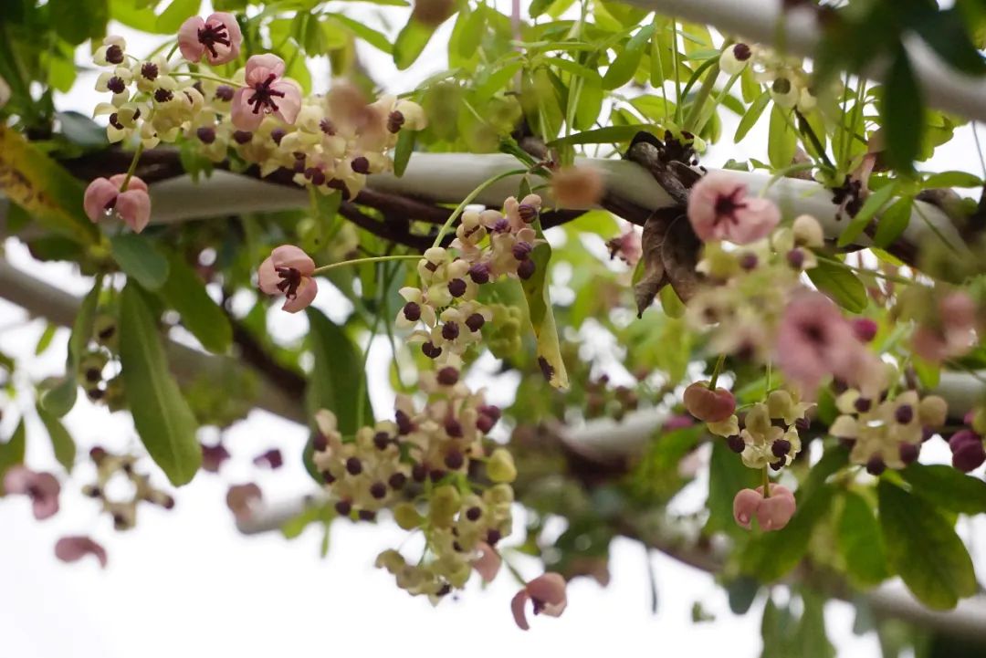 木通的花期一般在每年3月中下旬到4月中下旬,开花时,其花朵或紫或粉或白或绿等,一串串缀满藤蔓,会散发出巧克力般的芬芳,因此欧美也有“巧克力藤”之称。其花序为总状花序,雌雄同株异花,一般雌花位于花序基部,花朵较雄花大,雄花位于花序上部,花朵较小。一般同序或同株的雌雄花授粉不育,具有自交不亲和的特性,是一种较为严格的异花授粉植物,想要观果品果至少要种2棵。木通栽培管理相对比较粗放,一般在春天或秋天种植或移栽。果实成熟时,种子随采随播或者沙藏至翌年春天播种即可,不择土壤,但一定要选择排水良好且阳光充足的环境,待种苗开始抽藤时,布置好便于攀爬的藤架即可。木通虽耐阴,但喜光,在阴暗环境或缺乏光照时,往往会出现花量少或雌花数量极少的情况,观赏效果和经济效益也会大打折扣。