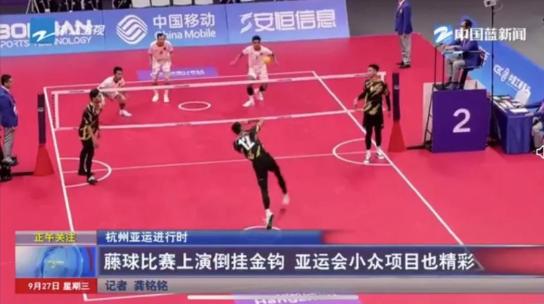 9月27日,浙江卫视《正午播报》栏目播出《杭州亚运进行时 藤球比赛上演倒挂金钩 亚运会小众项目也精彩》,关注亚运会藤球比赛在金华体育中心体育馆举行,比赛现场频频上演藤球特有的倒钩进攻,赛程激烈。