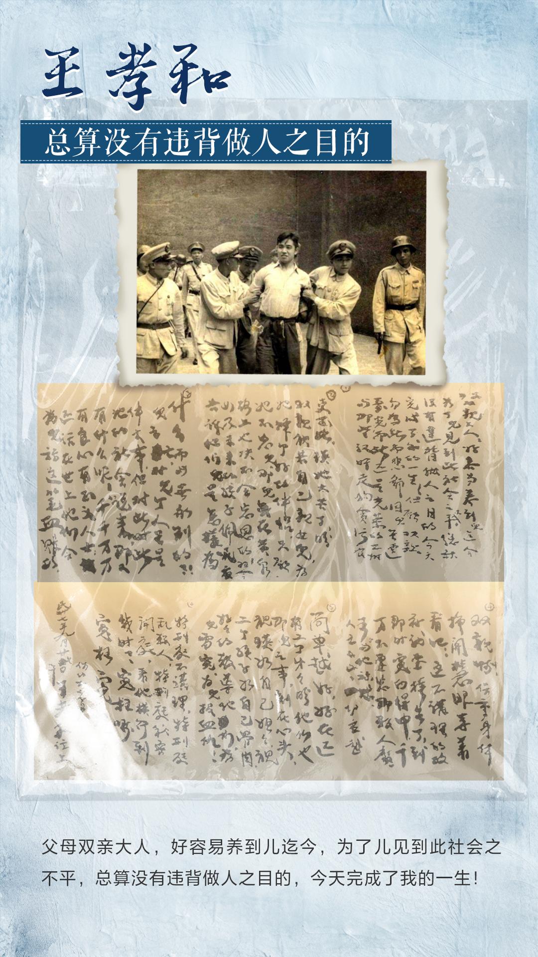 王孝和(1924~1948),宁波鄞县人,1941年5月加入中国共产党,曾任上海杨树浦发电厂工会干事、工会常务理事,为维护工人利益,不顾特务威逼,领导工人与厂方斗争。1948年4月,王孝和被捕入狱,在5个多月的铁窗斗争中,他写下了50封家书,平均3天一封,最短的53个字。同年9月30日,王孝和在上海提篮桥监狱被国民党反动派枪杀,他这张微笑着走向刑场的照片给我们永久的感动和激励!