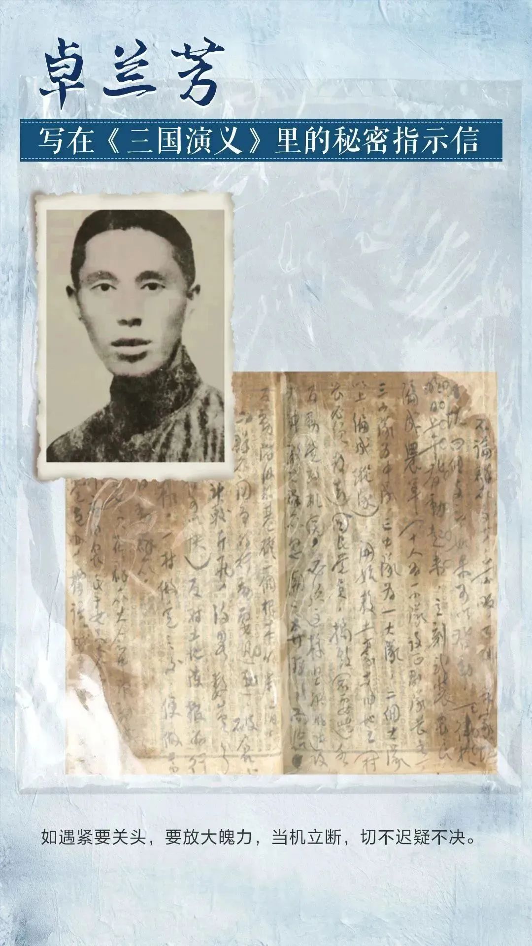 这封指示信是卓兰芳1930年4月密写的。为保守机密,他把给何达人及大东区委的指示信密写在《三国演义》的书本里。