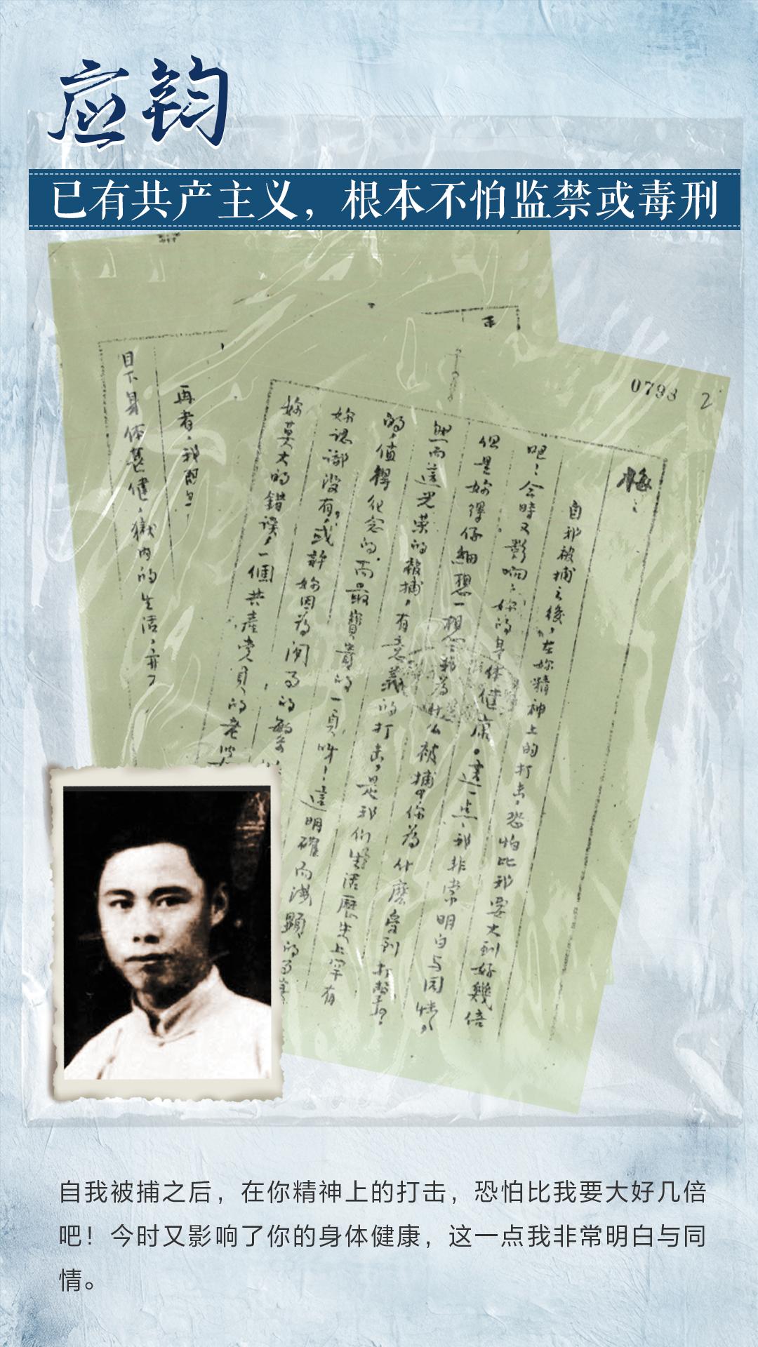 1942年,应钧奉派任台属特委交通员。他化名殷康泰,负责将一部分已经暴露的党员干部和追求进步的知识青年安全地转送到苏北新四军抗日根据地。同年,他因叛徒出卖被捕。在狱中,应钧给妻子金若梅写了一封信。信中,他因给妻子增添痛苦和牵累而深感愧疚,但他坚信自己心中的“主义”绝不转移,认定自己因革命事业被捕是光荣的,甚至给自己刚出生的孩子取名“志毅”,希望他能继承自己的意志和事业。