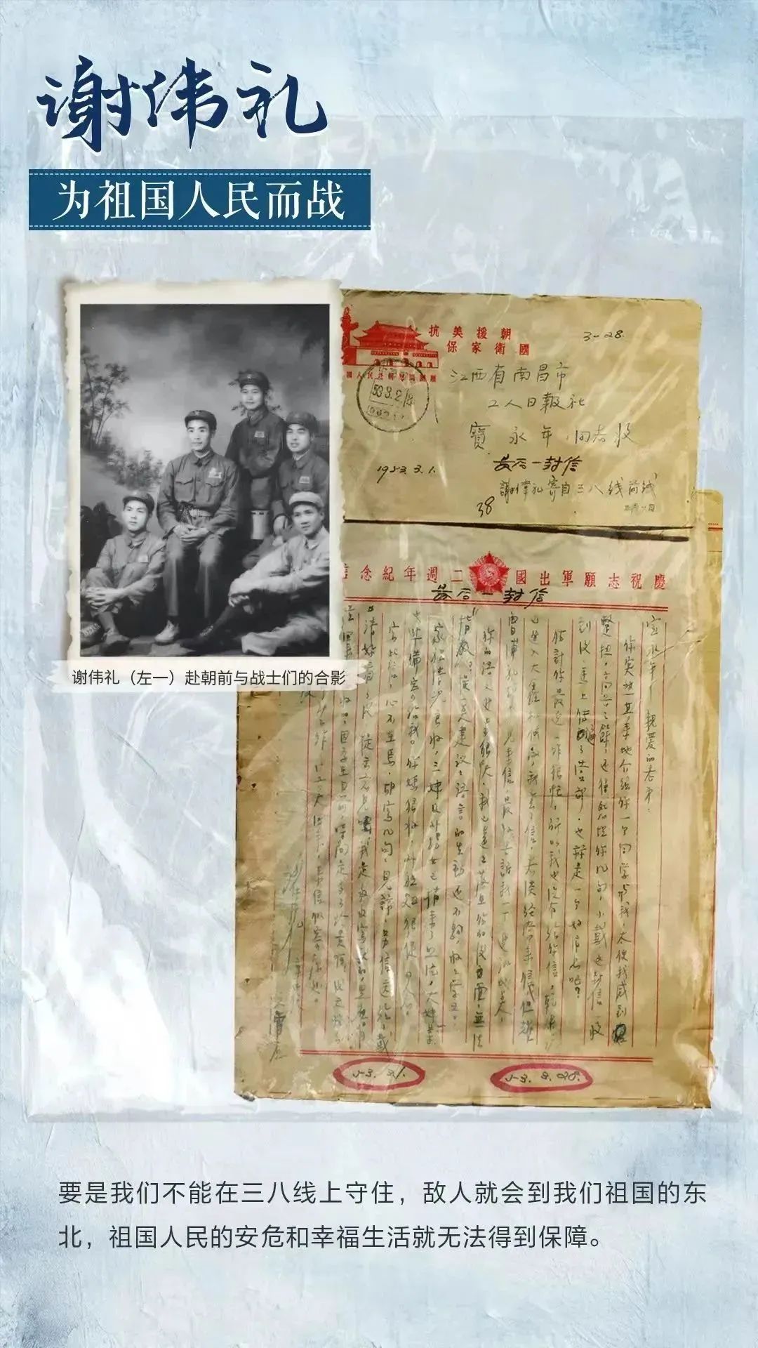 在紧张的战斗之余,谢伟礼常给家人写信。在他写于“三八线”上这最后一封家书中,我们不仅深切感受到幸福和平的不易,更被谢伟礼的“为谁而战”而感动!