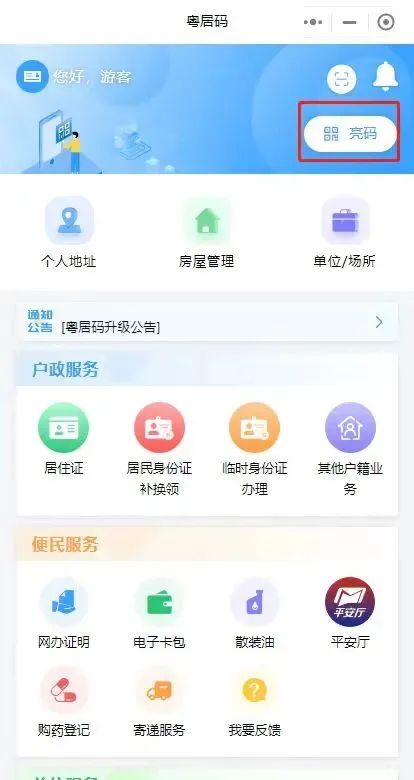 第一步:扫码登陆“粤居码”微信小程序,或微信小程序搜索“粤居码”。