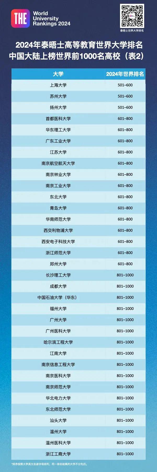 据悉,2024年排名中,中国大陆共有86所大学上榜,是入榜高校数量排名第五的国家/地区。进入世界排名前400名的中国大陆高校数量从去年的18所大幅增加至今年的30所。过去五年中,中国大陆高校在世界范围内进步最大,总平均分从2020年的35.5分上升到2024年的48.9分。