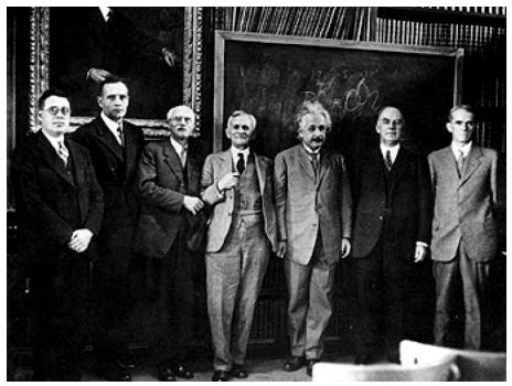 这次会面的合影,左起第二人是哈勃,第四人是艾尔伯特·迈克尔逊,第五人就是爱因斯坦,摄于威尔逊天文台的图书馆。