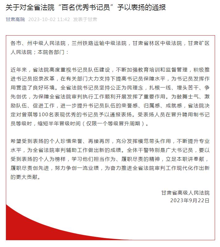 为鼓舞士气、激励队伍、促进工作,进一步提升书记员队伍的荣誉感、归属感、成就感,近日,省法院决定对曾琪等100名表现优秀的书记员予以通报表扬。兰州法院11名书记员荣获全省法院”百名优秀书记员“称号。