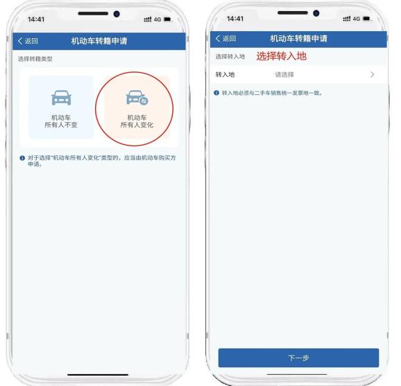 2、选择转籍类型为【机动车所有人变化】→ 选择要转入的城市