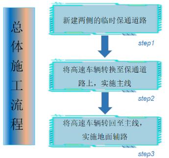 第二阶段:保通道路实施完成后,将高速车辆转换至保通道路上,拆除或利用现状主线,实施主线高架及道路。