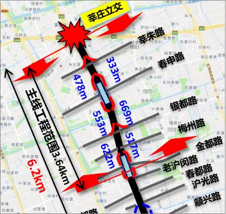 出入口布置:①莘朱路西侧设八字形出口,东侧入口匝道取消 ②春申路南北设两对出入口(加油站处南上匝道保通阶段仅设一根)③银都路以北设八字形出入口 ④金都路南北设两对出入口(北上匝道保通阶段仅设一根)。