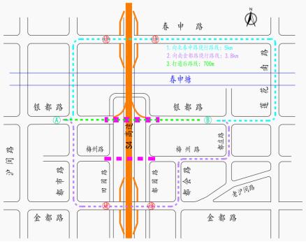 现状S4沪金高速(春申路一金都路)东西向道路仅有春申路、金都路是贯通的,银都路、梅州路被S4高速隔断。银都路作为越江主要干道被隔断,东西方向的通行需向北经春申路绕行(绕行5km)或向南经金都路绕行(绕行3.8km)。本工程实施完成后,将直接打通银都路与梅州路东西向交通,打通后两路口直行距离仅为700m,且能很大程度上缓解春申路、金都路的交通拥堵现象。
