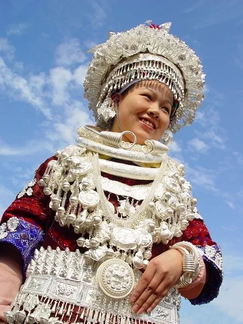 苗族佩戴银饰有着悠久的历史,银饰是苗族盛装不可缺少的装饰物。银饰品种类繁多,主要有银角、银冠、银项圈、围腰链、银手镯、银衣片等100多种,即使同一品种,纹饰各有千秋。