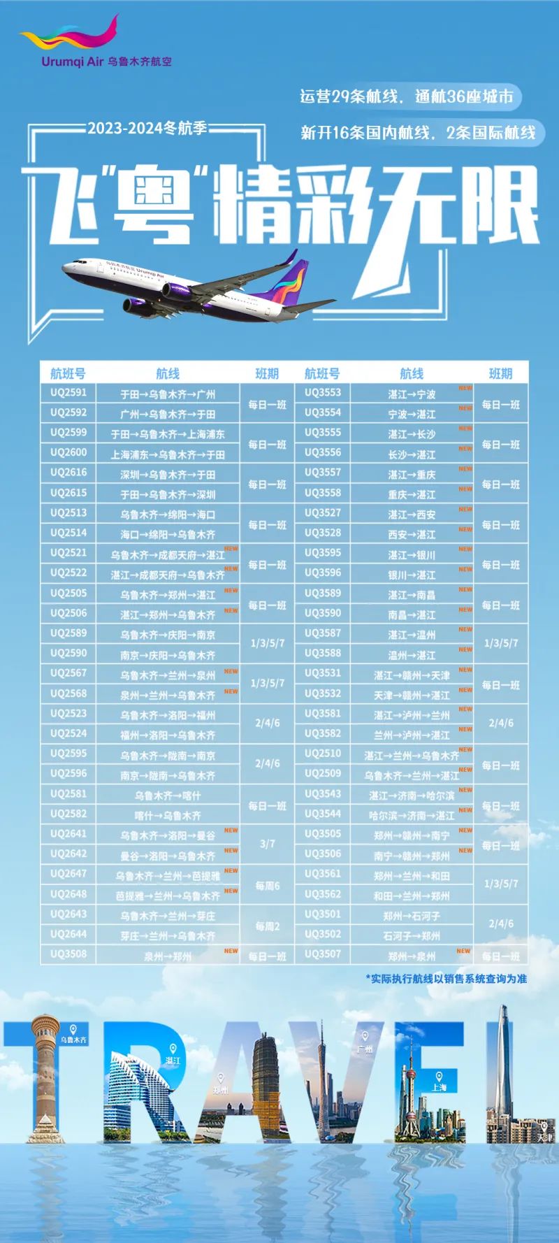 10月29日起,海航航空集团旗下乌鲁木齐航空有限责任公司执行2023年冬航季航班计划,新开多条国内航线,还将开通泰国和越南航线。