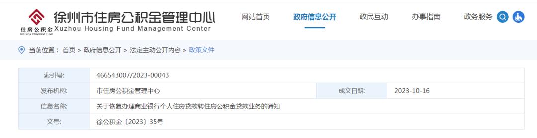 刚刚,徐州市住房公积金管理中心发布关于恢复办理商业银行个人住房贷款转住房公积金贷款业务的通知。