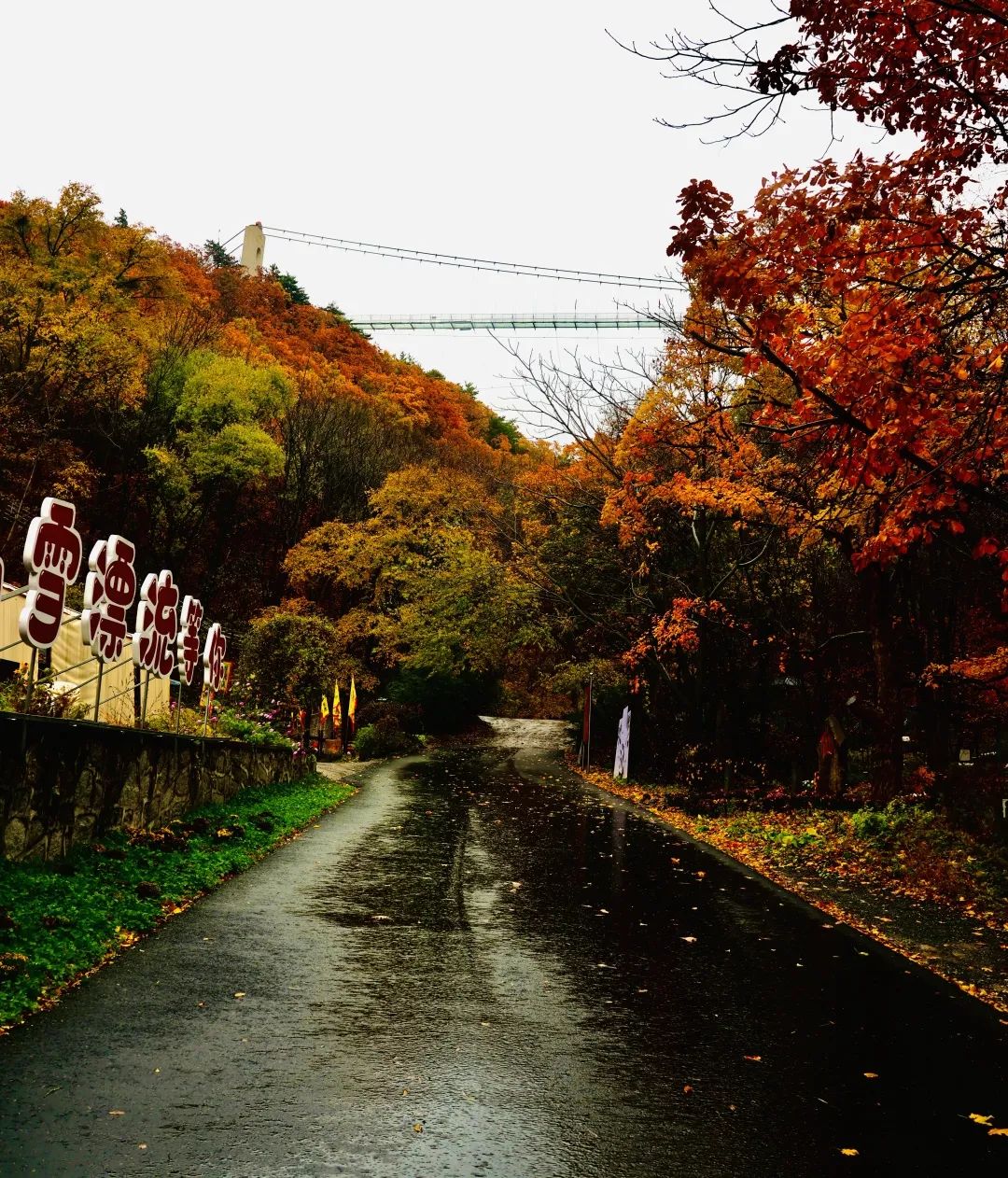 沿着公路向上慢行,山里已经满是深秋景象,落叶缓缓飘落,风声、雨声(小吉去的那天下雨啦~)还有山谷间回荡着的一种独特的悠长的声音,总之就是i人狂喜。走不一会便可来到上山的岔路。