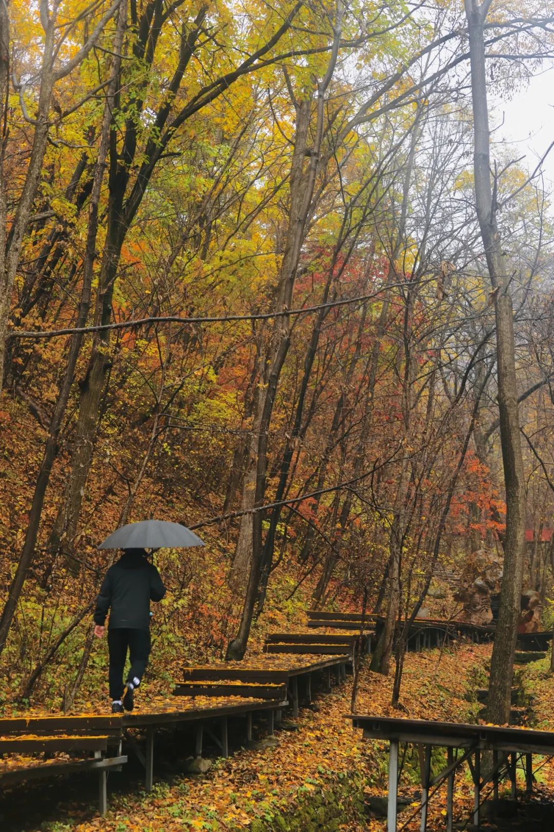 烟雨中的湿润空气给每一步都注入了动力,朦朦胧胧的森林与若隐若现的山峰构成了无与伦比的美景,走了一会,小吉恍然大悟,原来深秋的快乐,就藏在山里~