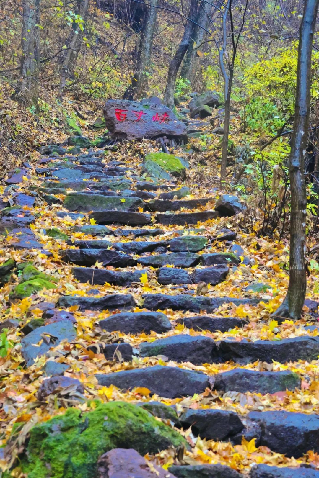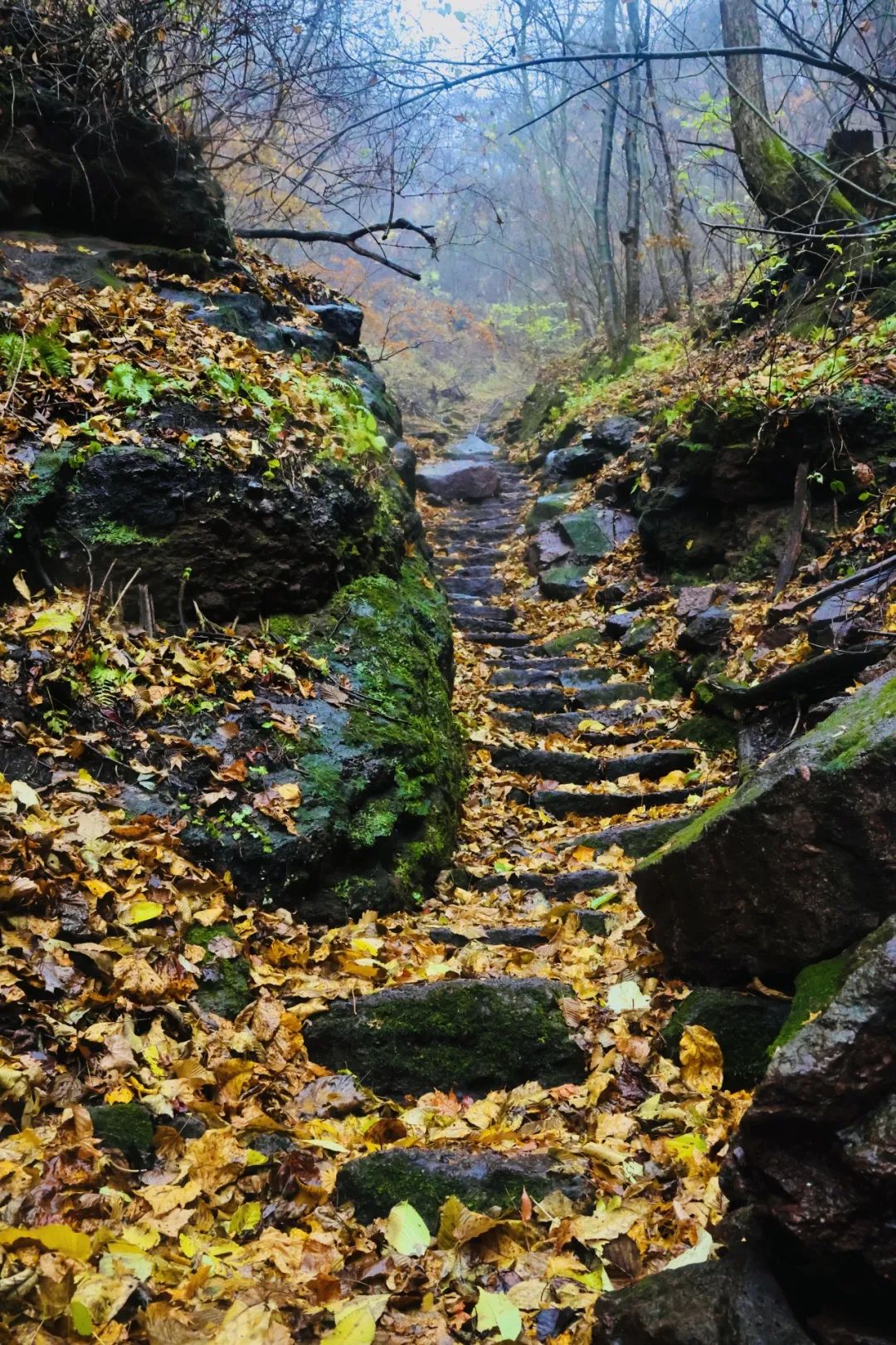 走过了木栈道,就是石阶铺成的登山路了,两边是陡峭的山坡,唯有中间这一条石阶可供通行,金黄的落叶铺满了这条上山的路。