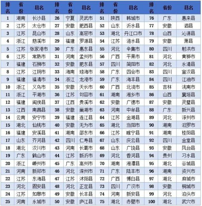 课题组对1866个县域进行了总体评价。数据来源包括:《2022年国民经济和社会发展统计公报》《2023各省市统计年鉴》《2022县和自治县的统计公报》《2022中国县域统计年鉴》,以及课题组在互联网上抓取的相关数据。排名前100的县域如表所示。