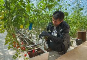 在喀什市英吾斯坦乡裁缝艾日克村村民托合塔吉·吾麦尔的温室大棚里,一串串红绿相间、个头饱满的番茄,在果柄上整齐排列,散发着淡淡果香。和有土种植相比,这种无土栽培的番茄采用的是椰糠基质种植,从定植再到成熟都是用滴灌浇水、施肥,可以有效减少病虫害对果蔬的影响,也让果蔬的产量和质量稳步提升。