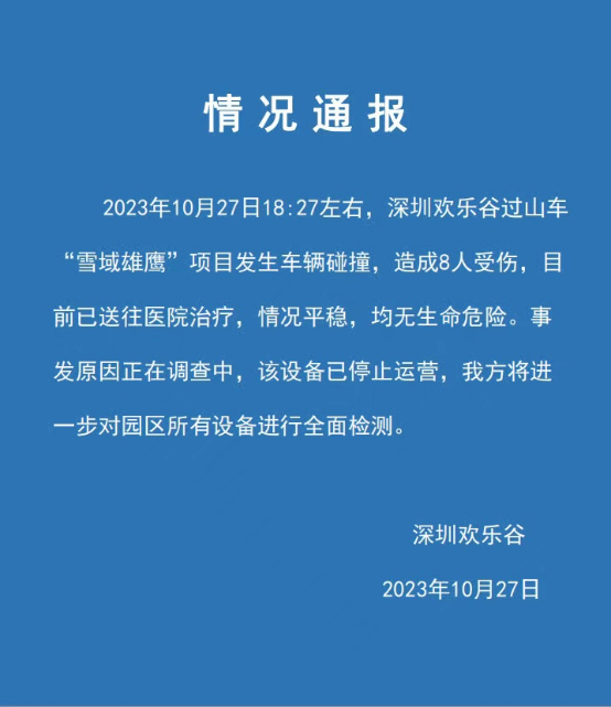 据相关媒体报道称,10月27日18:27左右,深圳欢乐谷过山车“雪域雄鹰”项目发生车辆碰撞,对此,深圳欢乐谷于当天在微博发布情况通报称,此事故造成8人受伤,目前已送往医院治疗。
