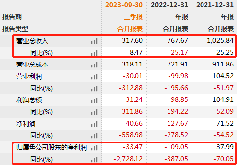 另一方面,华侨城A近几年频频陷入营收下滑、净利亏损的窘境。Wind数据显示,2021年-2022年及2023年前三季度,公司的营业总收入分别为1025.84亿元、767.67亿元、317.6亿元,同比增速分别为25.25%、-25.17%、8.47%;同期归母净利润分别为37.99亿元、-109.05亿元、-33.47亿元,同比增速分别为-70.05%、-387.05%、-2728.12%。