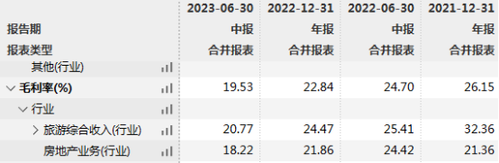 同时,华侨城A的主营业务毛利率下滑明显。2021年-2022年及2023年上半年,公司文化旅游业务的毛利率分别为32.36%、24.47%、20.77%;房地产业务的毛利率分别为21.36%、21.86%、18.22%,毛利率水平相对文旅业务下滑较为轻微。