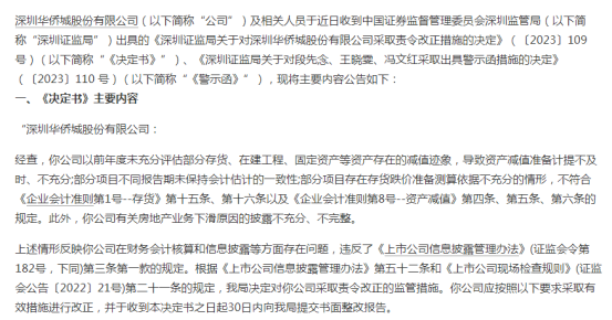 此外,华侨城A还因资产减值准备计提不及时、不充分收到行政监管措施。华侨城A于7月12日发布公告称,公司及相关人员于近日收到《深圳证监局关于对深圳华侨城股份有限公司采取责令改正措施的决定》、《深圳证监局关于对段先念、王晓雯、冯文红采取出具警示函措施的决定》。