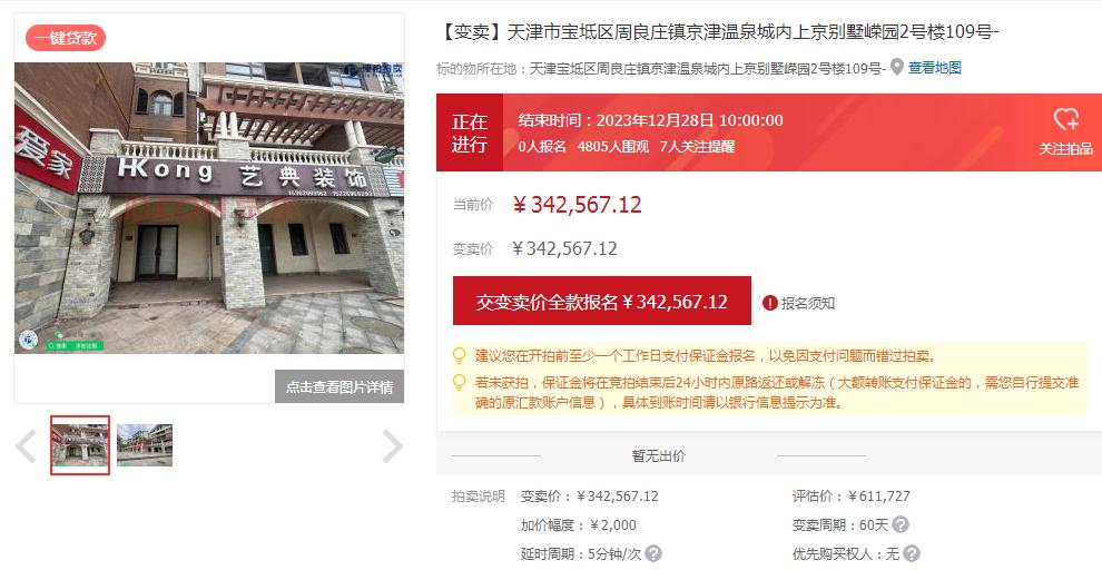 5.标的物名称:天津市宝坻区周良庄镇京津温泉城内上京别墅嵘园2号楼109号-