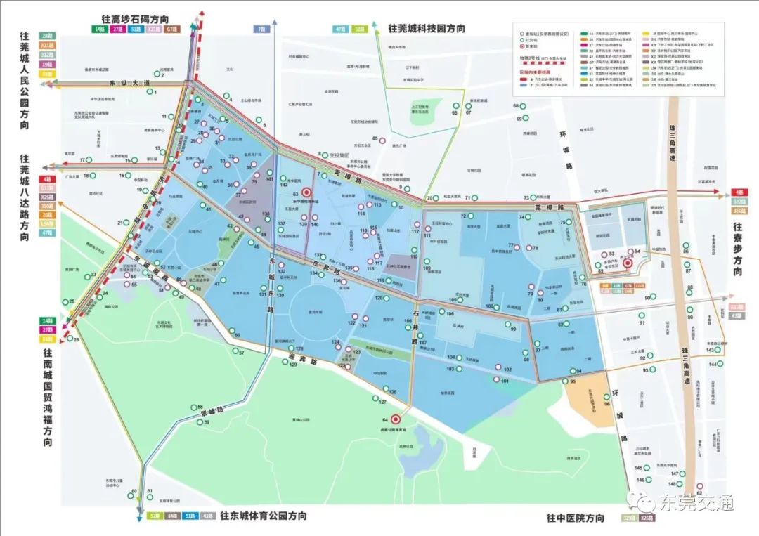 此外,还适当往外延伸到相对固定的人群集聚点,如旗峰公园等站点,实现东城中心片区内外的高效交通连接,共设有站点148个(区域内110个站点,区域外38个站点),固定站点101个、虚拟站点47个,基本覆盖整个片区范围。