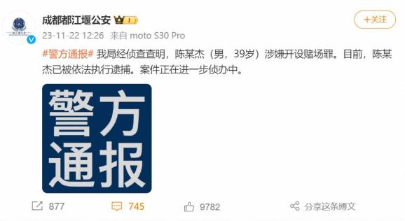 11月21日,斗鱼官网表示,公司于2023年11月20日获悉,CEO陈少杰于2023年11月16日左右被成都警方逮捕。11月22日,成都都江堰公安发出微博,表示“陈某杰(男,39岁)涉嫌开设赌场罪。目前,陈某杰已被依法执行逮捕。案件正在进一步侦办中”。