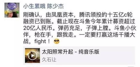 转机出现在2016年。8月15日,陈少杰发出一条朋友圈,表示斗鱼在2016年累计募资已经超过了20亿元人民币,“弹药充足,子弹上膛。斗鱼小伙伴,枪在手,跟我走。一定要打赢这场千播大战,fight!”