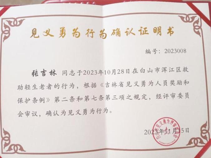 张吉林凭着自己的细心和热心,再次挽救一条生命,挽救一个家庭,事后,白山市公安局相关部门为张吉林的见义勇为行为进行了确认和审批。