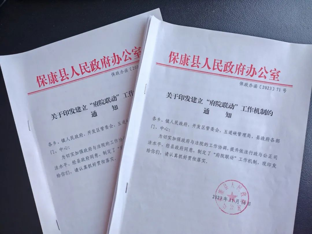 近日,为深入贯彻党中央关于全面依法治国的重大决策部署,进一步加强政府与法院的工作协调,实现行政与司法良性互动,提升依法行政和公正司法水平,保康法院积极向县政府报告,共同出台《“府院联动”工作机制》(以下简称《机制》)。