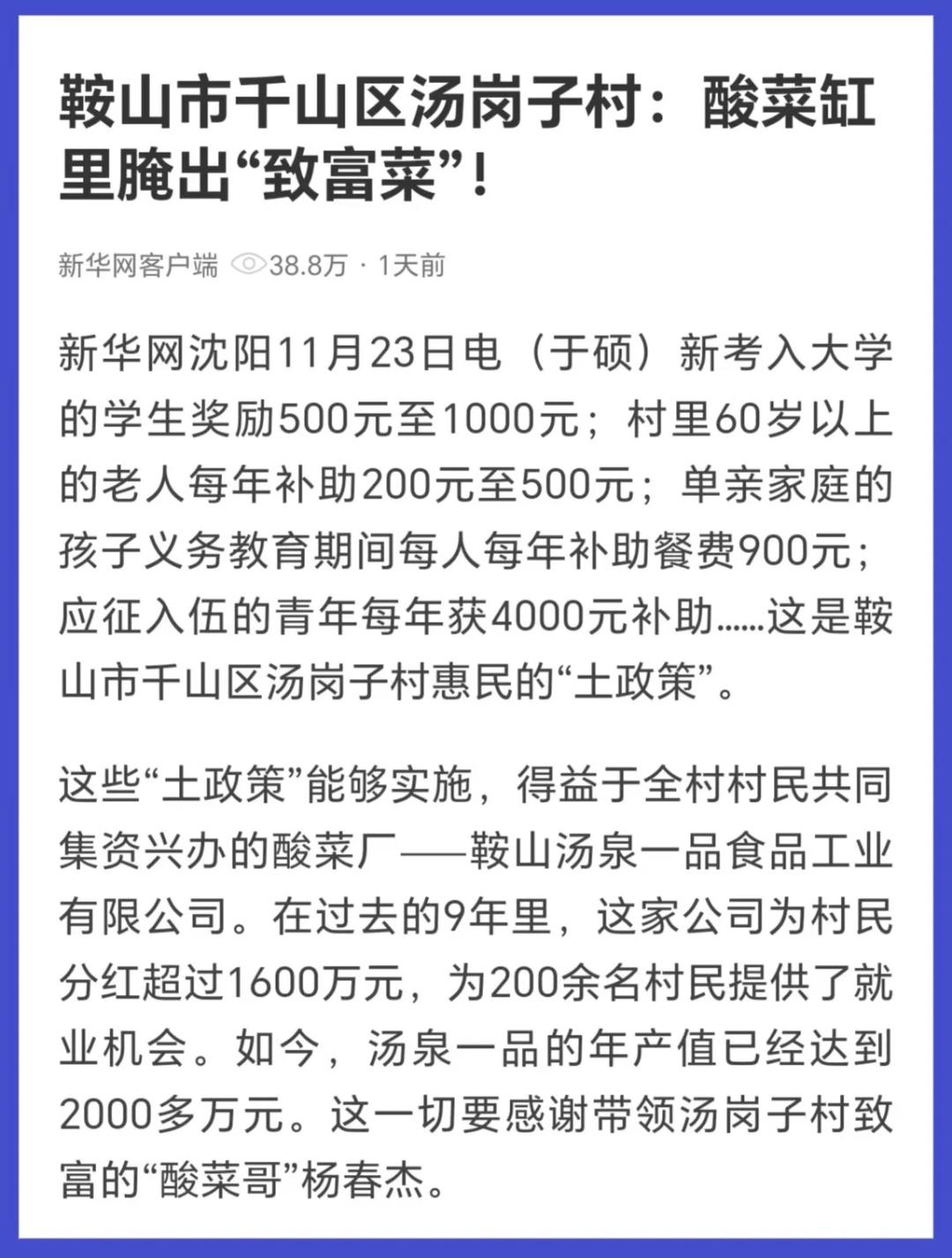 原标题:《央媒看鞍山|新华网客户端:鞍山市千山区汤岗子村:酸菜缸里腌出“致富菜”!》