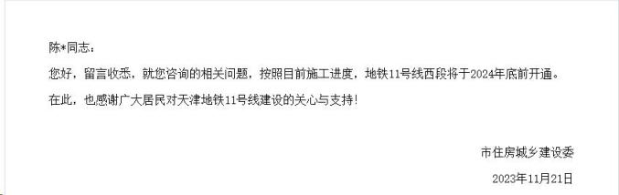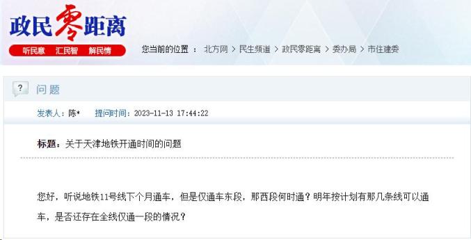 近日,有市民通过北方网“政民零距离”咨询关于天津地铁11号线西段开通时间的问题。