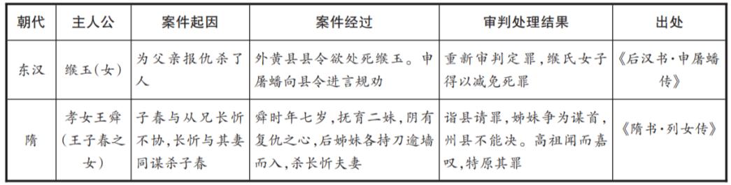 一则系主动杀人,一则系教唆蓄谋杀人,但目的却都具有同一性,即“志报父仇”,而且最后司法处理结果也都是得以免刑。前案卫无忌的父亲被同乡的卫长杀害,那时卫无忌只有六岁,又无兄弟,母亲已经改嫁,年少女子从小立誓要替父报仇。正逢养父宴请宾客,杀父仇人卫长也在场,卫无忌伺机将其杀死,于是主动向官吏交代父仇已报,甘愿受刑。司法官员褚遂良听说此案后,上报皇帝,皇帝为之感叹,将其免罪。后案贾孝女十五岁时,家父被族人玄基杀害,贾孝女甘愿不嫁人,躲避仇家并自己抚育年幼的弟弟贾强仁长大,贾强仁长大后贾孝女教唆他杀死玄基,果然贾强仁挖出了杀父仇人玄基的心在父亲墓坟前祭奠。贾强仁向官府投案,司法官员判定贾强仁死罪,贾孝女向官府请求甘愿代替弟弟受刑罚,皇帝为此深感怜悯,颁布诏令免去了他们的死罪。像这样为因血亲复仇,而蓄谋杀人,虽被囚系,终以赦宥,得宽刑戮的案例历史上并不罕见,笔者不再一一赘述,以表格形式再列举两例,分析其中理据: