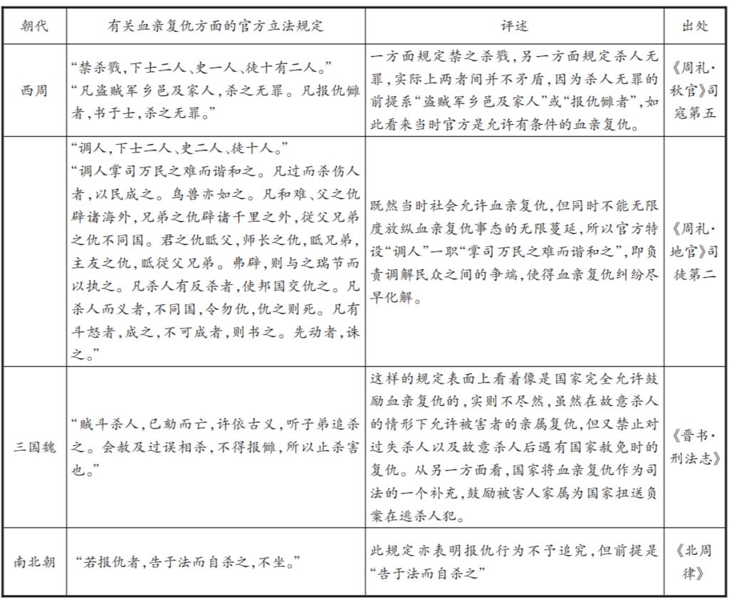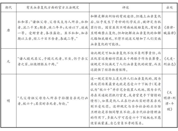 关于血亲复仇方面的立法各朝各代还有很多,由于笔者能力有限无法全部列举,但通过以上举例分析足以说明中国古代立法对血亲复仇并不是一味地禁止,也从未彻底地否定,历代律典也都或多或少地对对血亲复仇做出了妥协与让步。