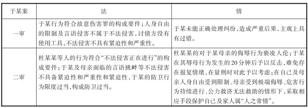 于某案中,“辱母”二字冲击着中国传统的情感价值。民众朴素的情感价值观认为于某是不应当受到法律制裁的,其行为在法律之外存在广泛的合理性基础,而这一行为却被司法做出否定性评价,由此引发民众对法律本身的质疑。一审判决抛开了“辱母情节”这一重要道德传统因素的考量,片面强调了“法”的因素,忽略了被害人的过错和对人格尊严、人身自由的保护,对刑法中“理性人”的要求标准过高,认为即便是在母亲受到极端侮辱、人身自由被剥夺的情况下,仍应当保持理性,以正当行为处理纠纷。此种判断与人民群众心中的正义观念极度不符,引发广泛争议,造成公众对司法裁判的误解。二审则对“不法侵害”的内容进行合理解释,在此基础上充分考量“辱母”情节,认定被害人存在严重过错,以保护人身自由和人格尊严为落脚点,得出于某的行为应当减轻处罚的结论,填补了情与法之间的缝隙,获得了良好的社会效果。