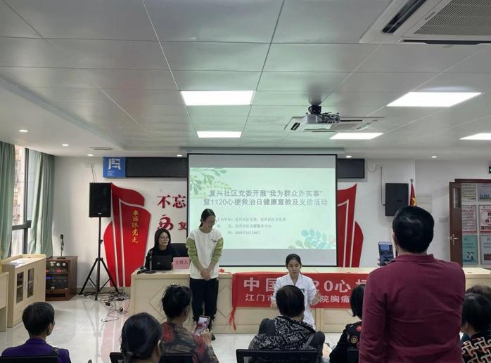 为了让居民在家门口享受到专业的健康服务,提升居民健康意识,复兴社区党委联合江门市五邑中医院胸痛中心开展心梗救治日健康宣教义诊活动,现场为居民科普心梗相关健康知识,提供初级心肺复苏技能培训及健康检查、健康咨询;侧贤社区举办“懂健康知识,做健康老人”老年人疾病预防健康知识讲座,为辖区居民普及老年人慢性疾病预防知识,增强老年人自我保健意识。