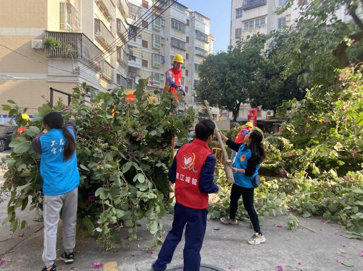 辖区内许多树木由于种植年份久远,生长茂密,部分树枝不仅遮挡住居民家里采光,甚至触及高压线,存在极大安全隐患。为了帮助居民解决难题,明文社区党委与大党委成员单位蓬江区市容景观和园林绿化管理中心开展“我为群众办实事”主题党日活动,安排修剪队伍对聚贤苑的紫荆树、大王椰树等树木进行高空修剪,并组织社区党员志愿者、网格员、志愿楼长、双报到党员等收拾清理枝叶;马腾社区大党委成员单位市交通运输局认领出资清理修剪位于蓬江区农林西路春晖苑小区侧边山坡的绿植树木,并对山坡体进行检查,不仅消除了安全隐患,也还居民一个舒适的宜居明亮的居住环境。