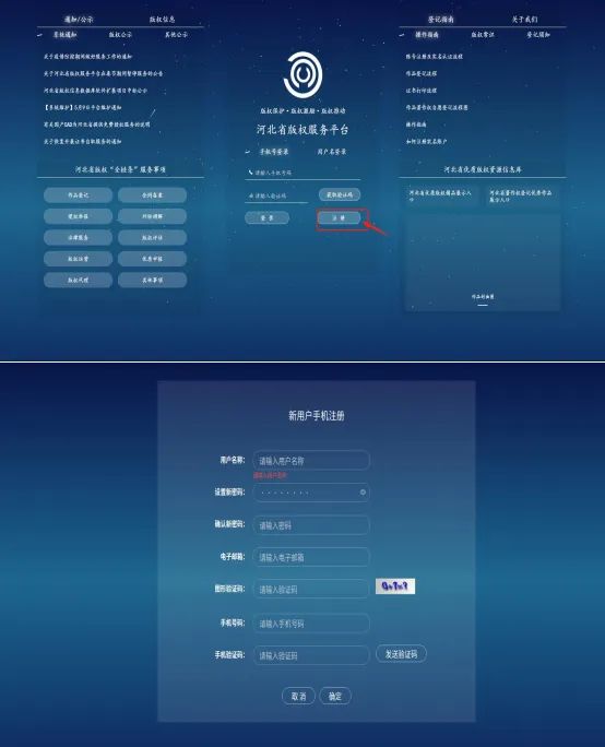 登录服务平台(https://www.hebeibanquan.com.cn/)点击注册填写账号信息(个人、企业注册流程相同,需要注意的是企业注册账号时“用户名称不能用企业真实名称 ”)