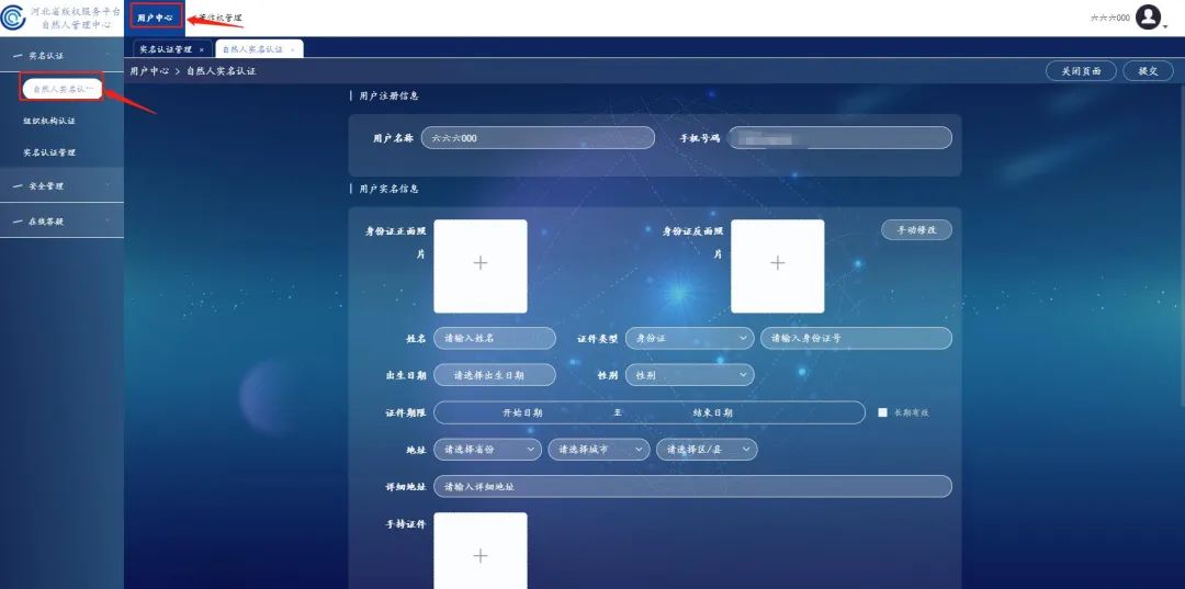 1、个人实名认证:“用户中心-实名认证-自然人实名认证”,依次填写实名认证信息并上传身份证正反面照片及手持身份证照片。身份证正反面照片图片一定要清晰可见,另外非河北省户口还需要上传暂住证明或工作证明。