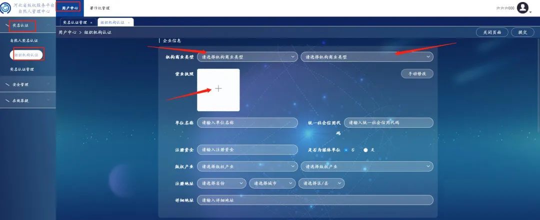 4.在“用户中心—实名认证”中根据用户类型选择“自然人实名认证”或“组织机构认证”完善用户实名认证信息并提交审核;
