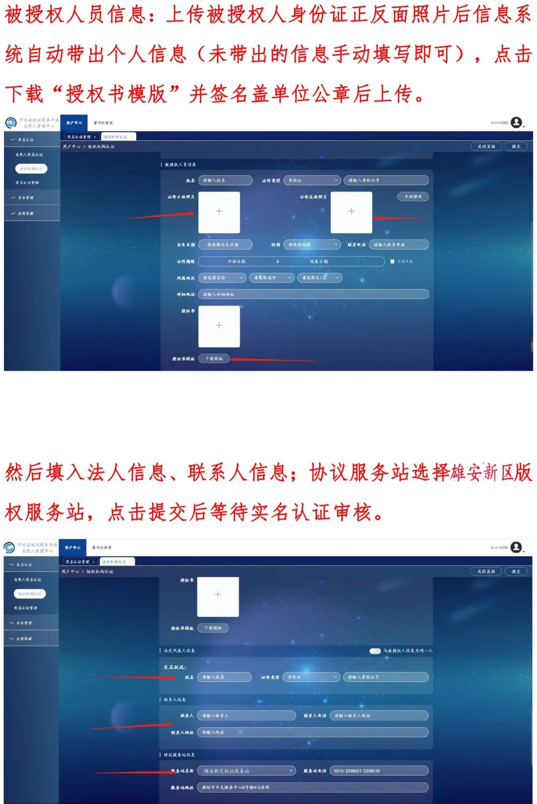 注:1.“自然人”为河北省内(或暂住)的公民,“组织机构”为在河北省内注册的法人或非法人组织;2.实名认证时协议服务站信息选择“雄安新区版权服务站”。