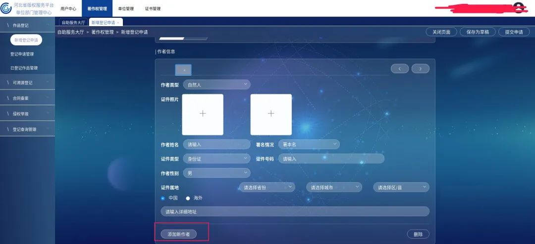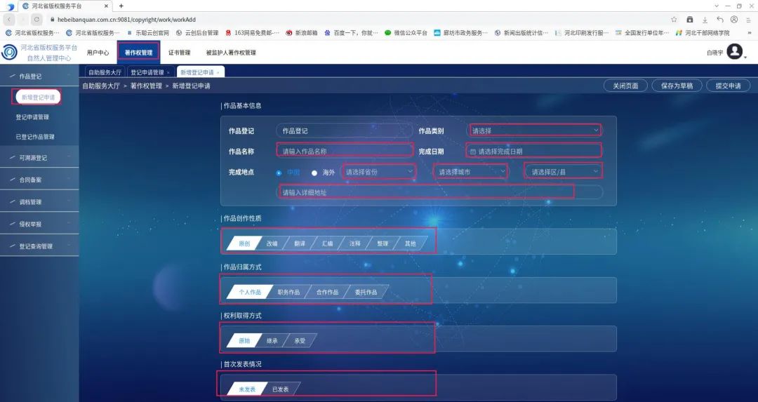 2.点击“著作权管理—作品登记-新增登记申请”,进入作品登记页面;