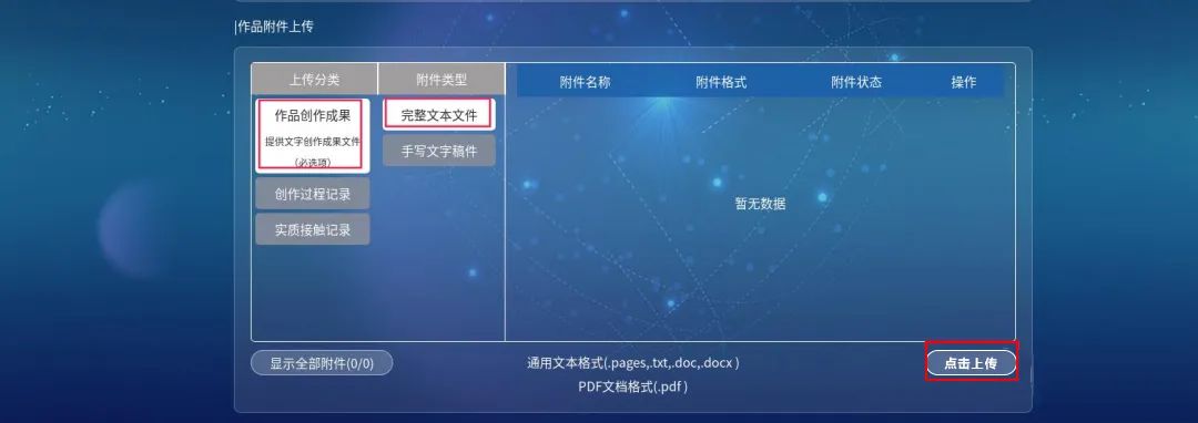 平台支持上传“作品创作成果”、“创作过程记录”、“实质接触记录”文件,选择“上传分类”、“附件类型”,点击“上传附件”完成附件上传。