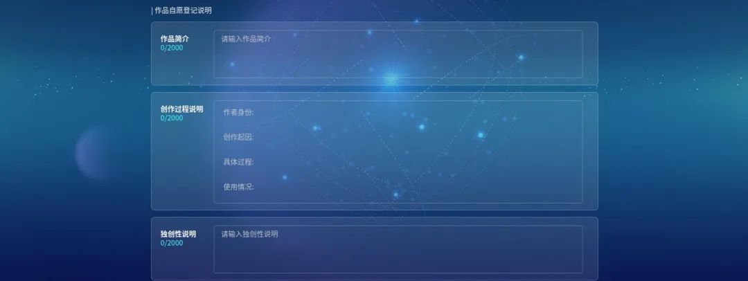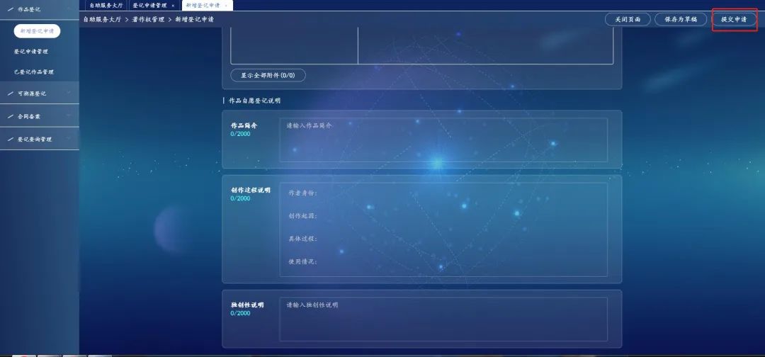 3.按平台要求完善作品相关信息,上传相关附件,填写作品自愿登记说明书后,点击“提交申请”;